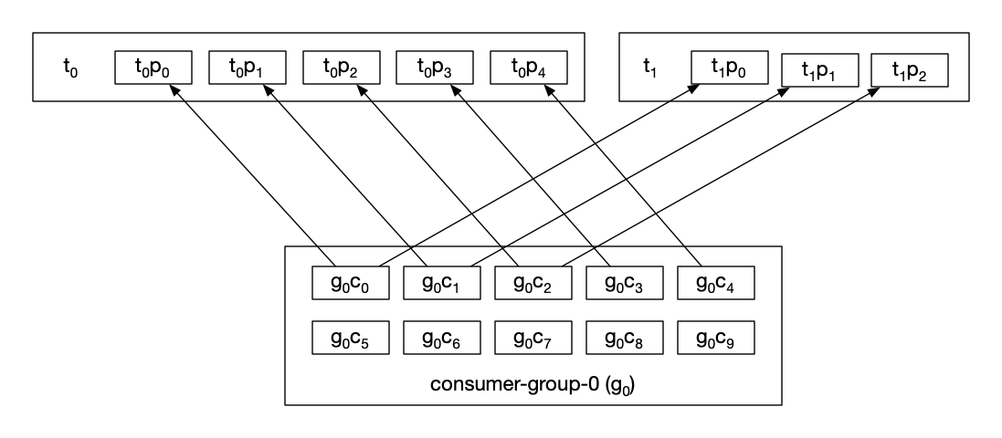 Consider a topic-partition setup with a consumer group (g0), where each consumer in the group subscribes to (t0, t1) (disregard replication factor):